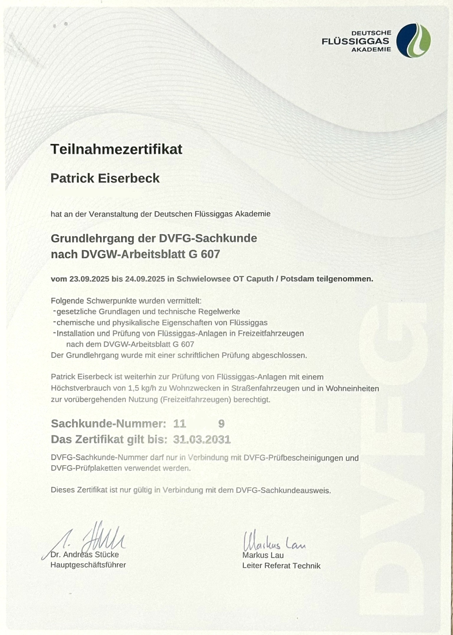 - Sachkundiger G607-Prüfer für Gasprüfungen an Freizeitmobilen