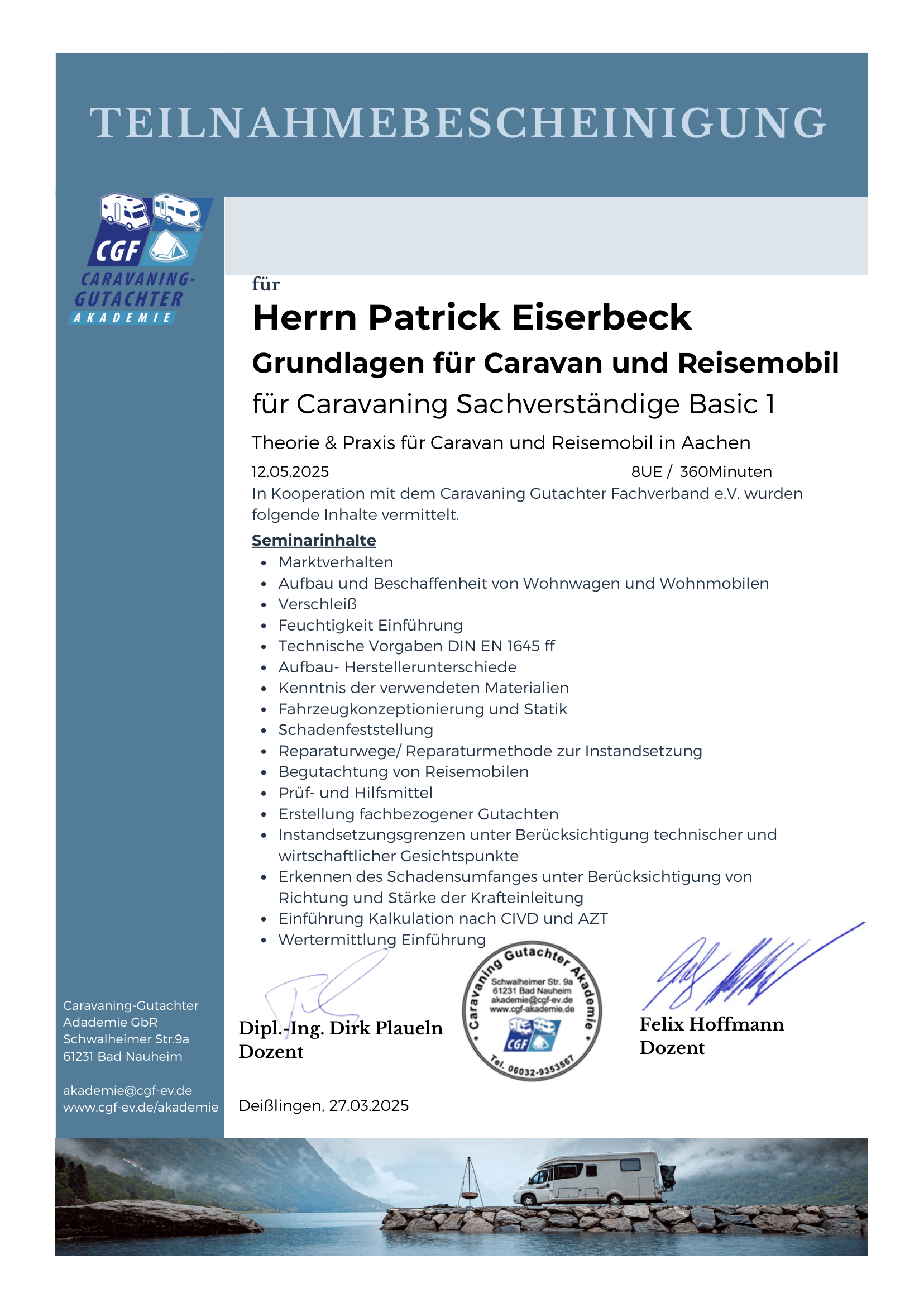 - Geprüfter Caravan- und Wohnmobilexperte (CGF – Caravaning Gutachter Fachverband)